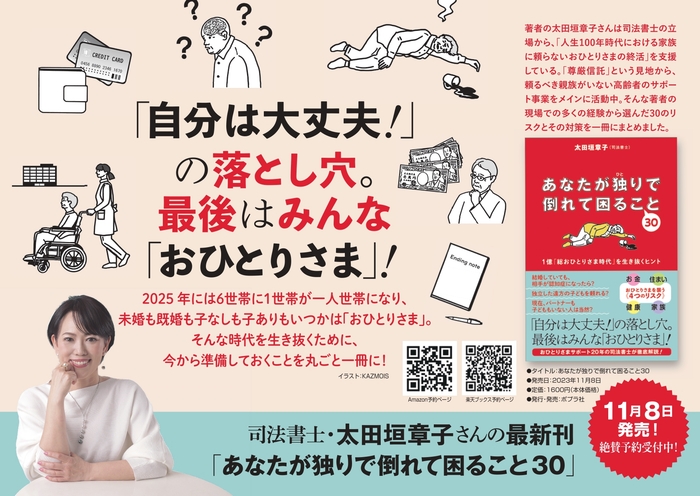 不動産賃貸トラブルの専門家として、住まいを中心に生活が立ち行かなくなった高齢者のサポートを20年以上続ける司法書士、太田垣章子さんの新刊『あなたが独りで倒れて困ること30』がポプラ社より11月8日に刊行されます。
