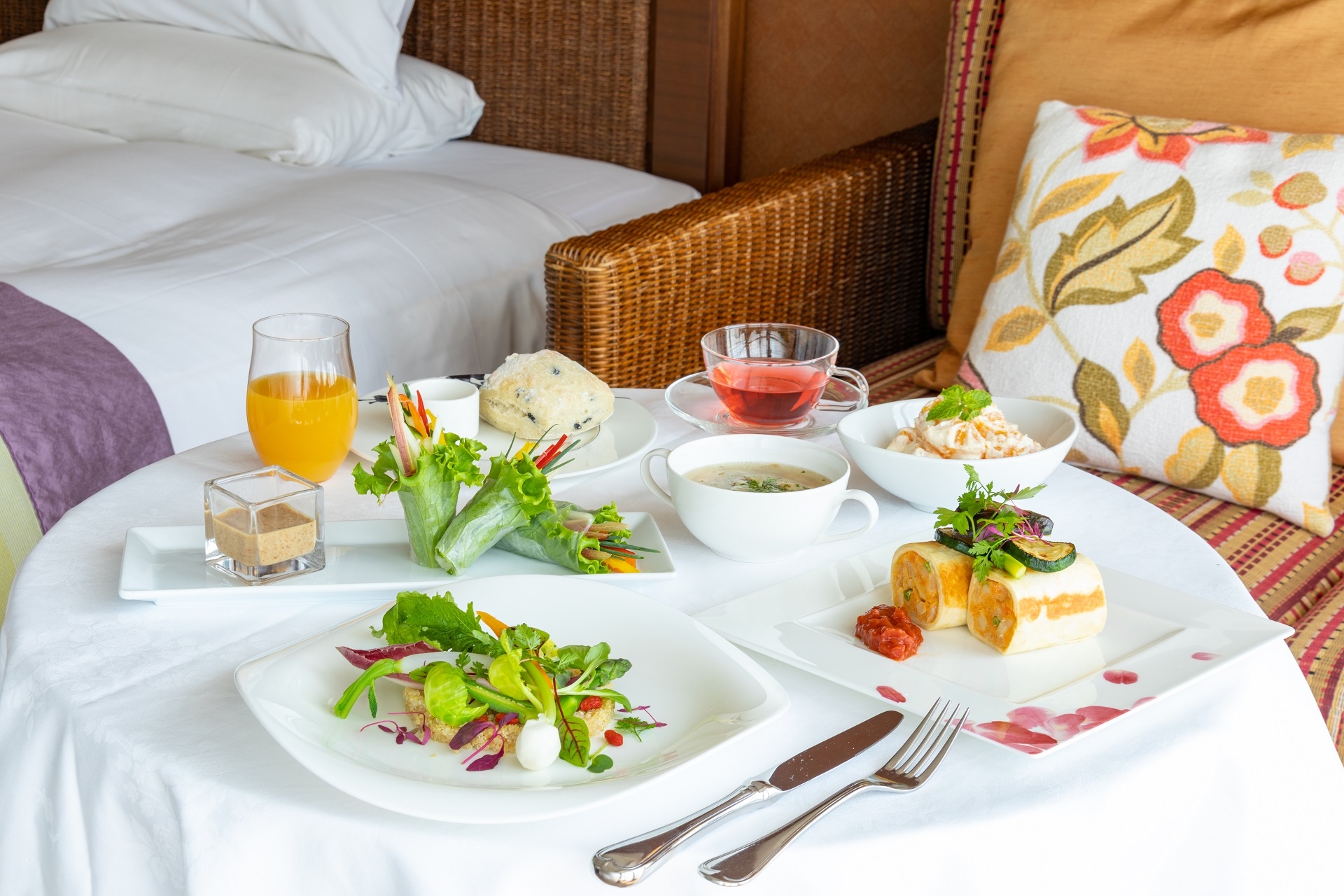 お食事は、沖縄の太陽の恵みを受けてすこやかに育った地元産の野菜や果物、旬の素材を中心に、管理栄養士監修による「デトックス&腸活」「身体も喜ぶ‟口福“」をテーマに、総料理長が腕を振るいご用意したこのプランだけの特別メニュー。