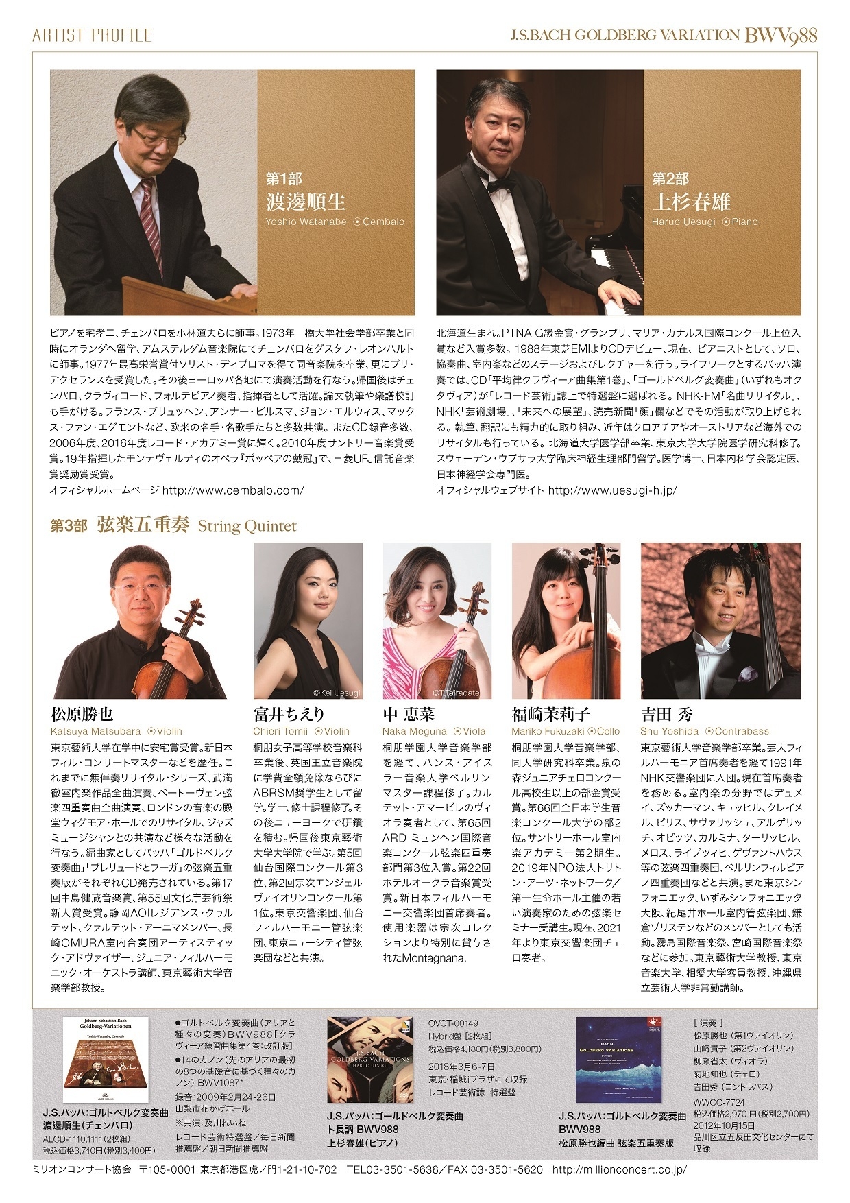 コンサートは全3部で構成され、第1部はオリジナルの二段チェンバロ、第2部は現代のピアノ、第3部は弦楽五重奏版により、それぞれの分野で考え得る最高の『ゴルトベルク変奏曲』の一日をお届けします。