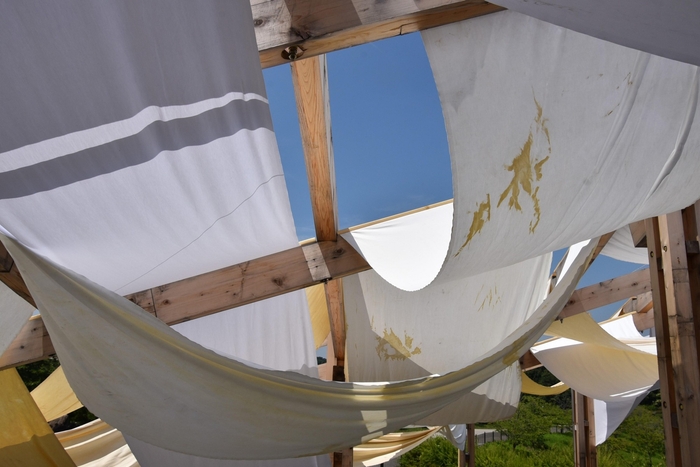 「長雨の季節に入り 山々の緑は一層深みを増して行く。その晴れ間に吹く風は夏の気配を感じさせる。階段の高低差を利用し、包まれるような空間を作った。大きな綿布は日光の陰影や、風の流れを可視化する。上り下りする中で身の回りの自然に目を向けてもらうことを考えた」
