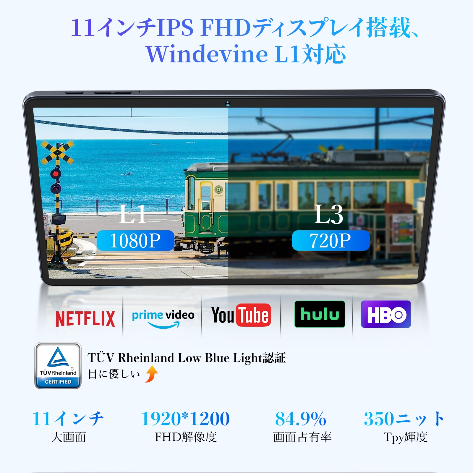 11インチ IPSディスプレイは1920×1200解像度に対応。WidevineはL1サポートとなっており、大きめの画面と合わせて、メディア視聴に適しています。
