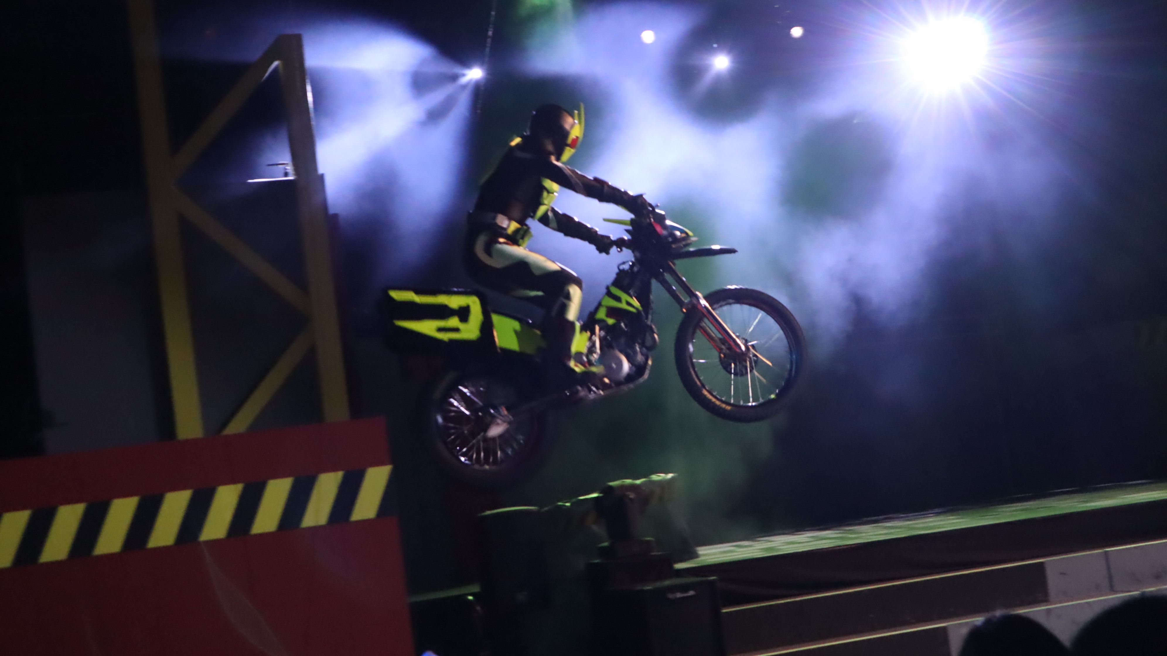 毎年冬の恒例となった東映太秦映画村の「仮面ライダー大集合バトル」。 昨年はオートバイ競技「トライアルバイク」のチャンピオンをはじめ、一流のスタッフが終結したバイクパフォーマンスが登場。耳をつんざくエンジン音とステージを所狭しに繰り広げられるあり得ない神技に大人も魅了され話題となりました。