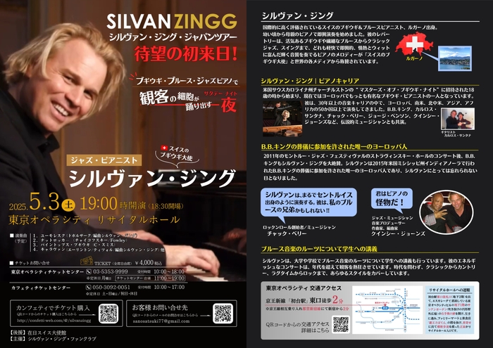 シルヴァン・ジング・フアンクラブ主催、『ブギウギ・ブルース・ジャズピアノ』が2025年5月3日 (土・祝)に東京オペラシティ リサイタルホール (地下1階 )(東京都 新宿区 西新宿 3-20-2 西新宿東京オペラシティ3階)にて開催されます。