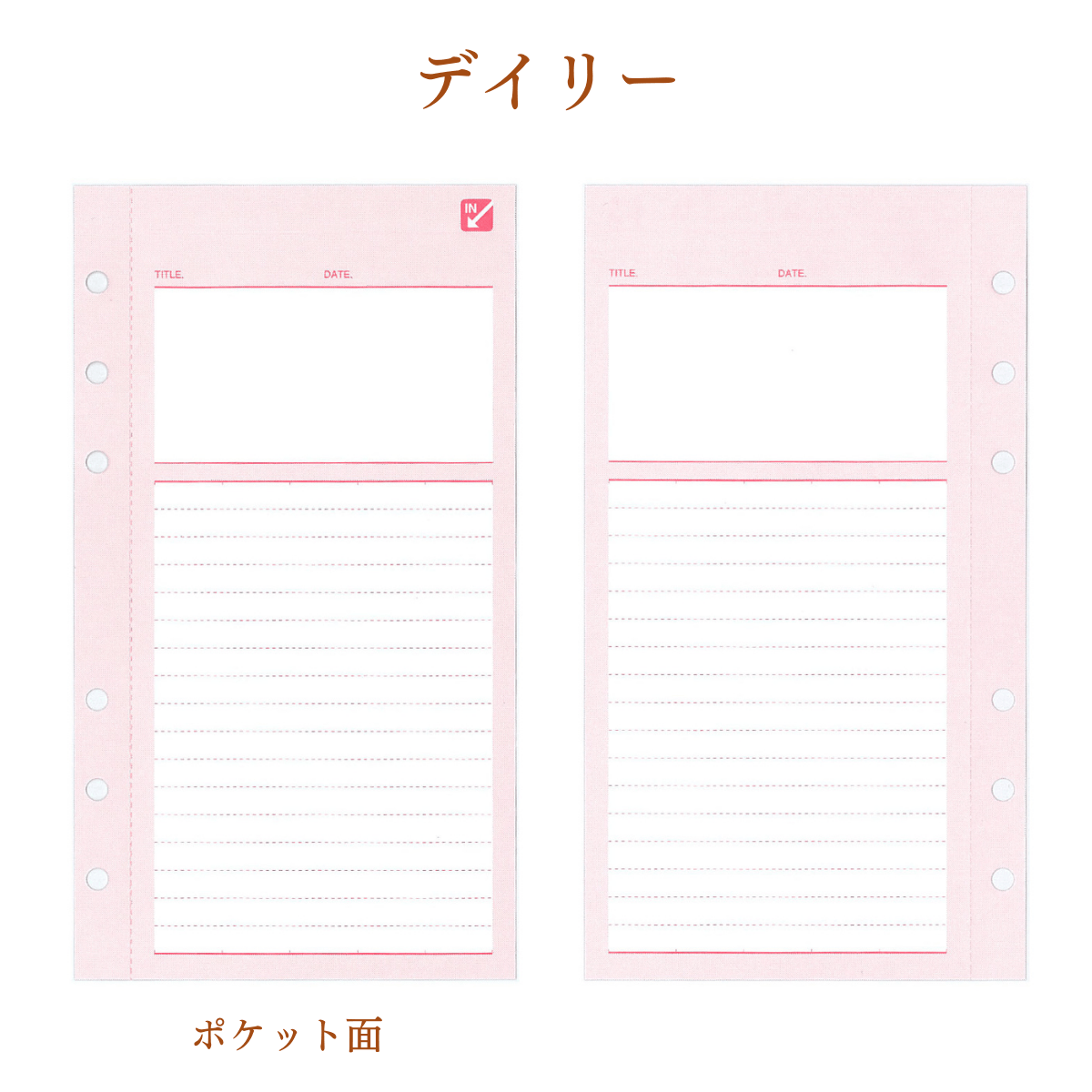 通常のダイアリーなどとしてお使いいただけます。ページが袋状になっているので、ちょっとしたものを手渡しする際に、システム手帳から切り離し、ポチ袋として使えます。レシート・メモ・チケットを手帳に挟んだり、貼ったりせずに、袋部分に入れて収納する使い方もできます。