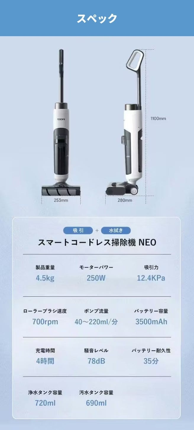 「ROIDMI NEO」は1回の充電で約150㎡(45坪分)の使用が可能です。