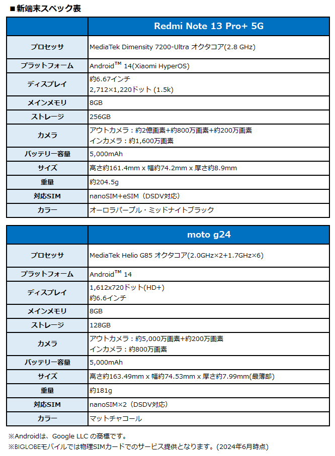ビッグローブ株式会社(本社:東京都品川区、代表取締役社長:山田 靖久、以下 BIGLOBE)は、モバイルサービス「BIGLOBEモバイル」において、Xiaomi製スマートフォン「Redmi Note 13 Pro+ 5G」とMotorola製スマートフォン「moto g24」の提供を2024年6月3日より開始します(注1)。