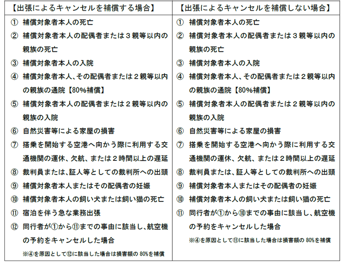 ①~⑫の事故を原因として、その事故が生じた補償対象者が他の航空機の予約もあわせてキャンセルする場合は、他の航空機の予約のキャンセルによって被保険者が被った損害に対して保険金を支払います(④を原因として他の航空機の予約をキャンセルした場合は損害額の80%を補償します。)。