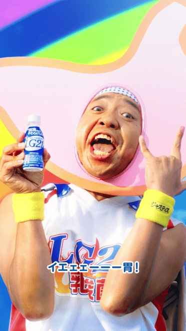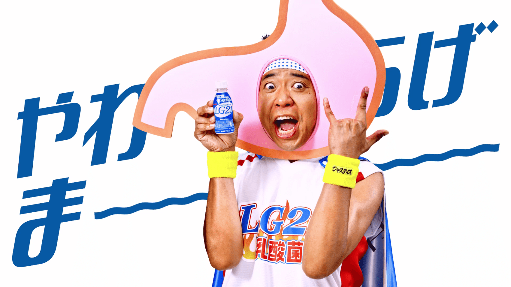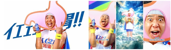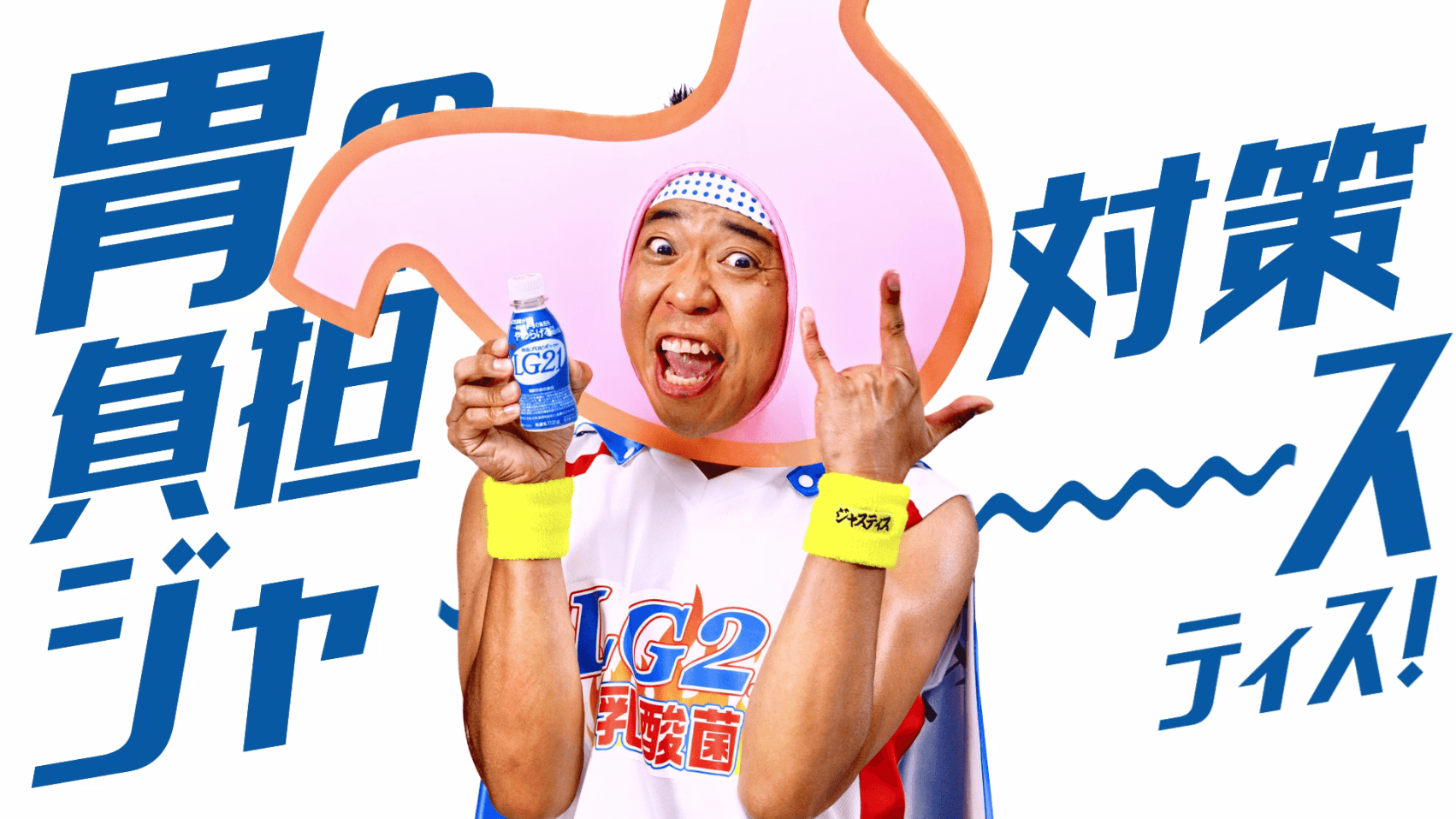 公式X上で、タレントはシークレットにして公開していた「胃にはLG21♪」のサウンドロゴ。歌っていたのはサンシャイン池崎さんでした。本動画には、胃の負担対策の神・イケザキLG21マンが登場。胃の形を模した被り物をつけ、“胃”の文字が背中にあしらわれたマントを羽織ったヒーローのような出で立ちで、LG21乳酸菌を“空前絶後の胃の負担をやわらげる乳酸菌”として紹介します。雷や荒波を吹き飛ばす演出と共に繰り出される、良い状態の胃を表現した「イエェェーーー胃!」という池崎さんの激しい叫びと、合間に入る「胃にはLG21♪」の穏やかな歌声がつらい胃の負担をやわらげるイメージで、LG21を体現しています。