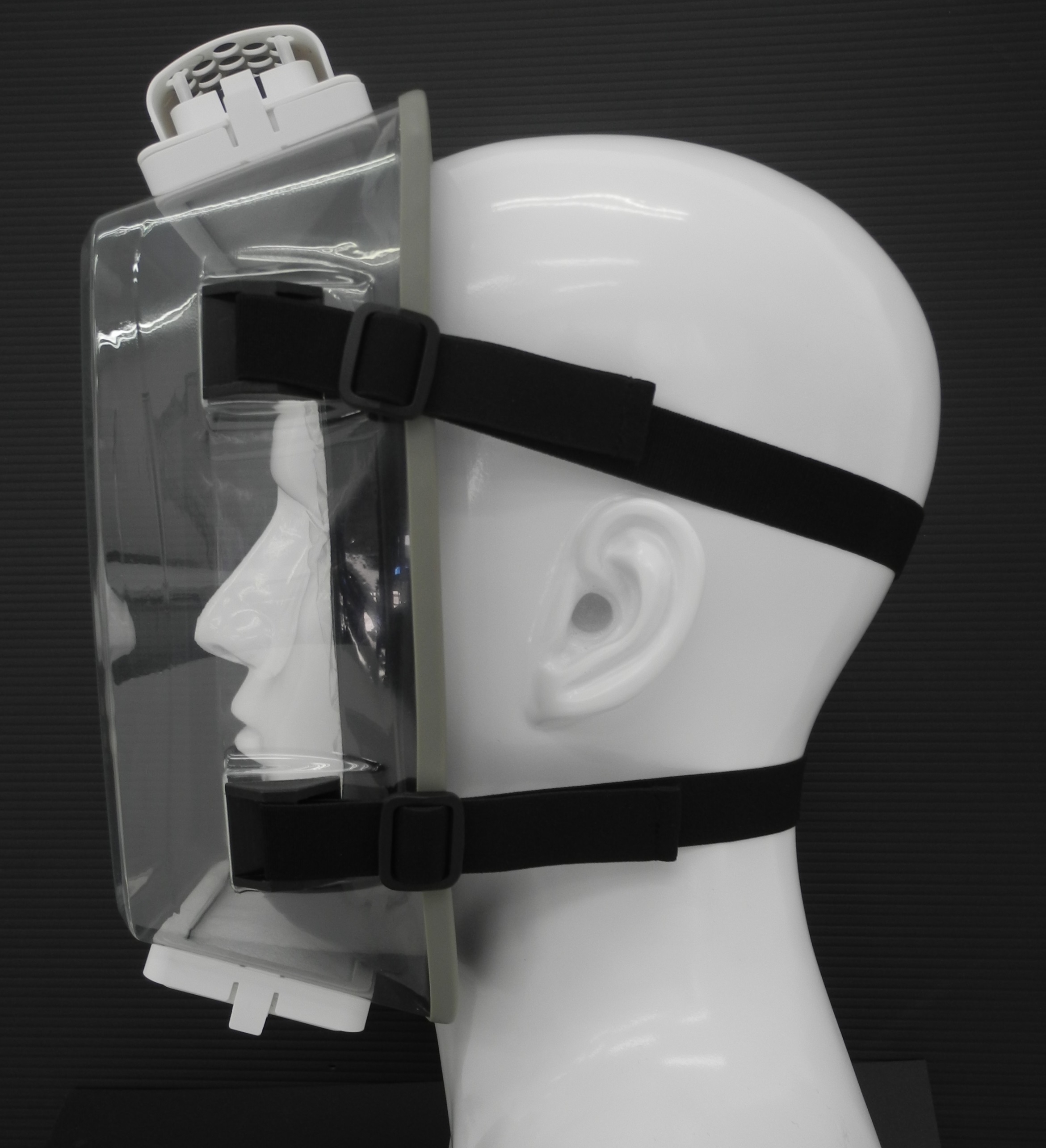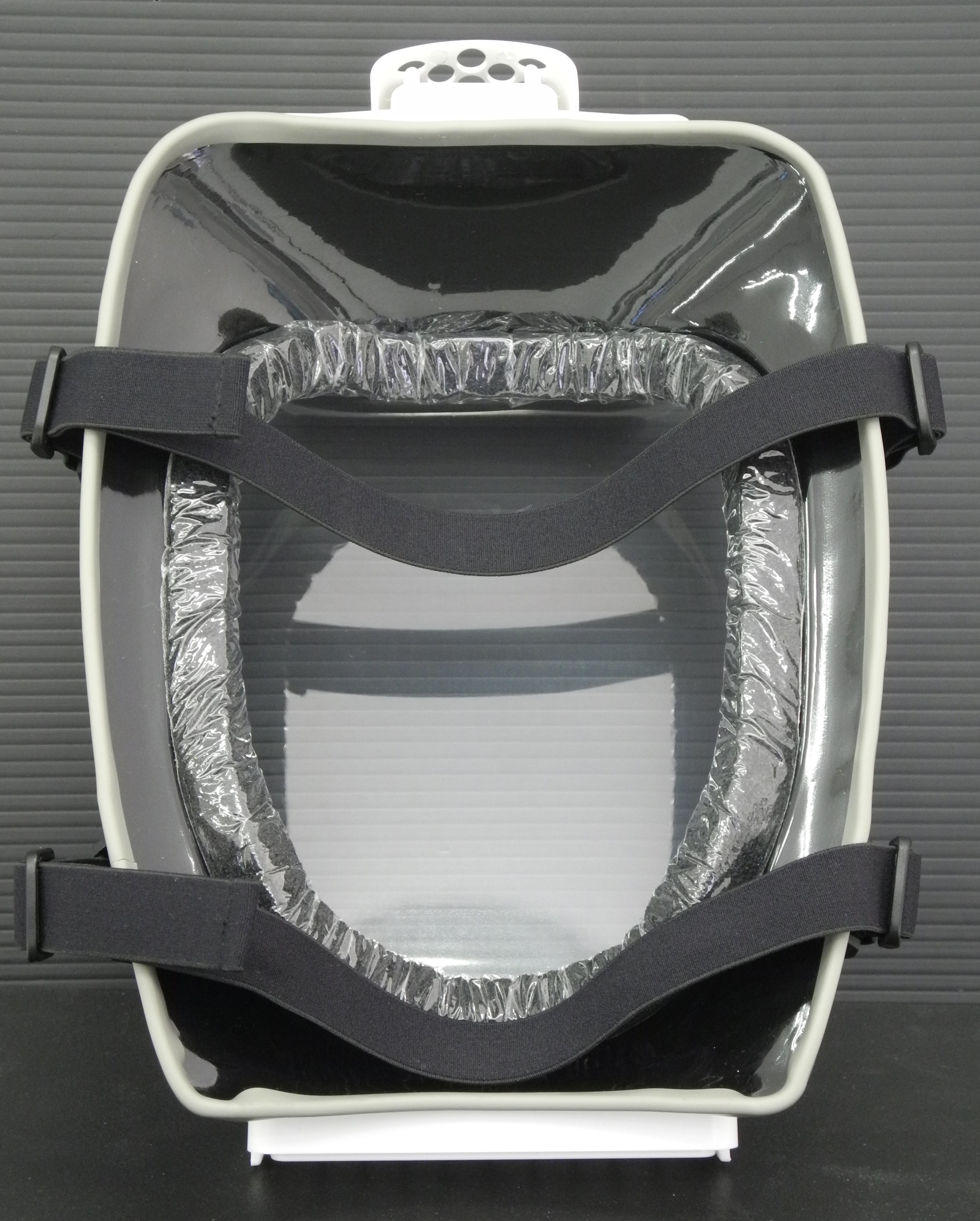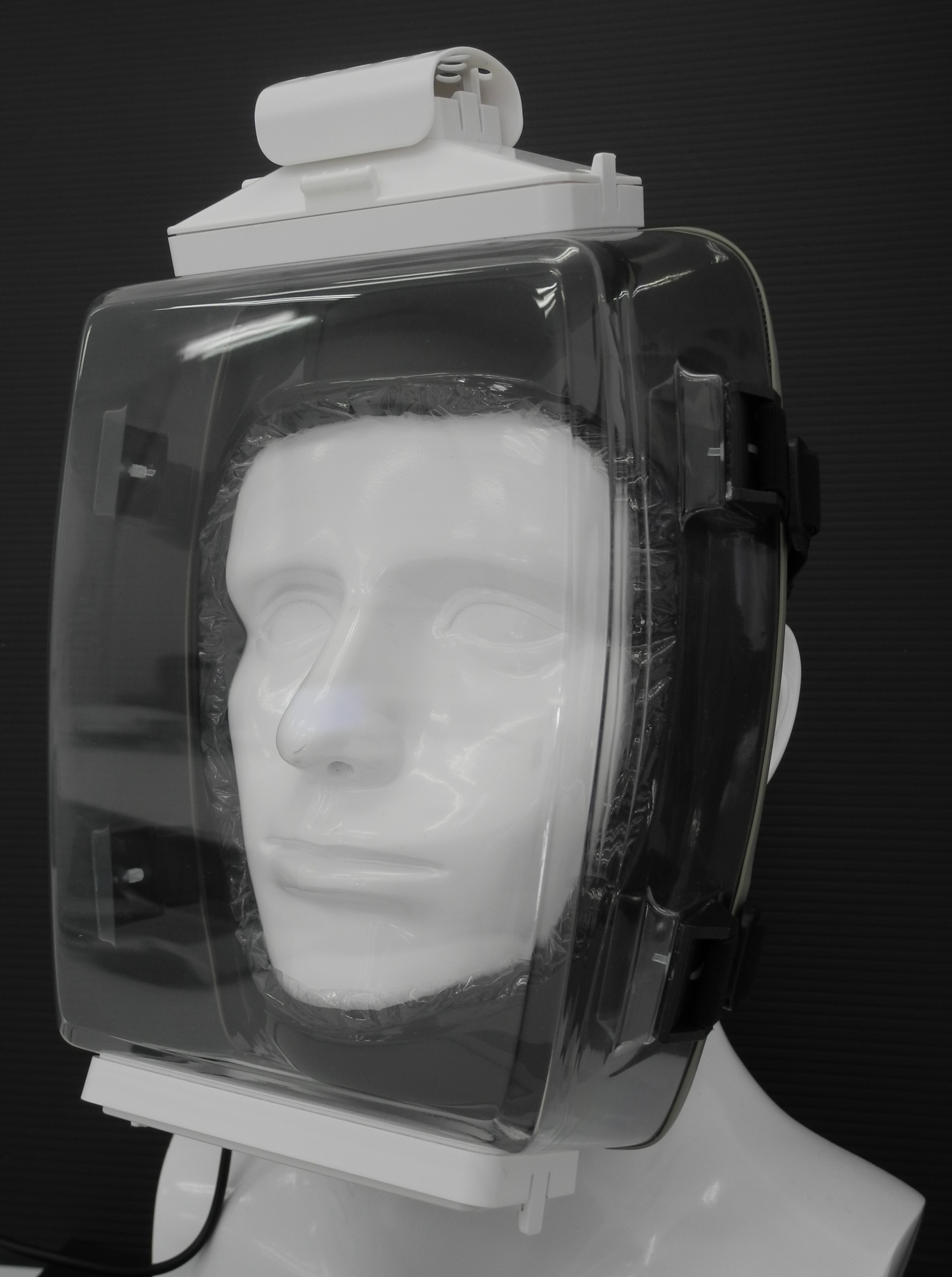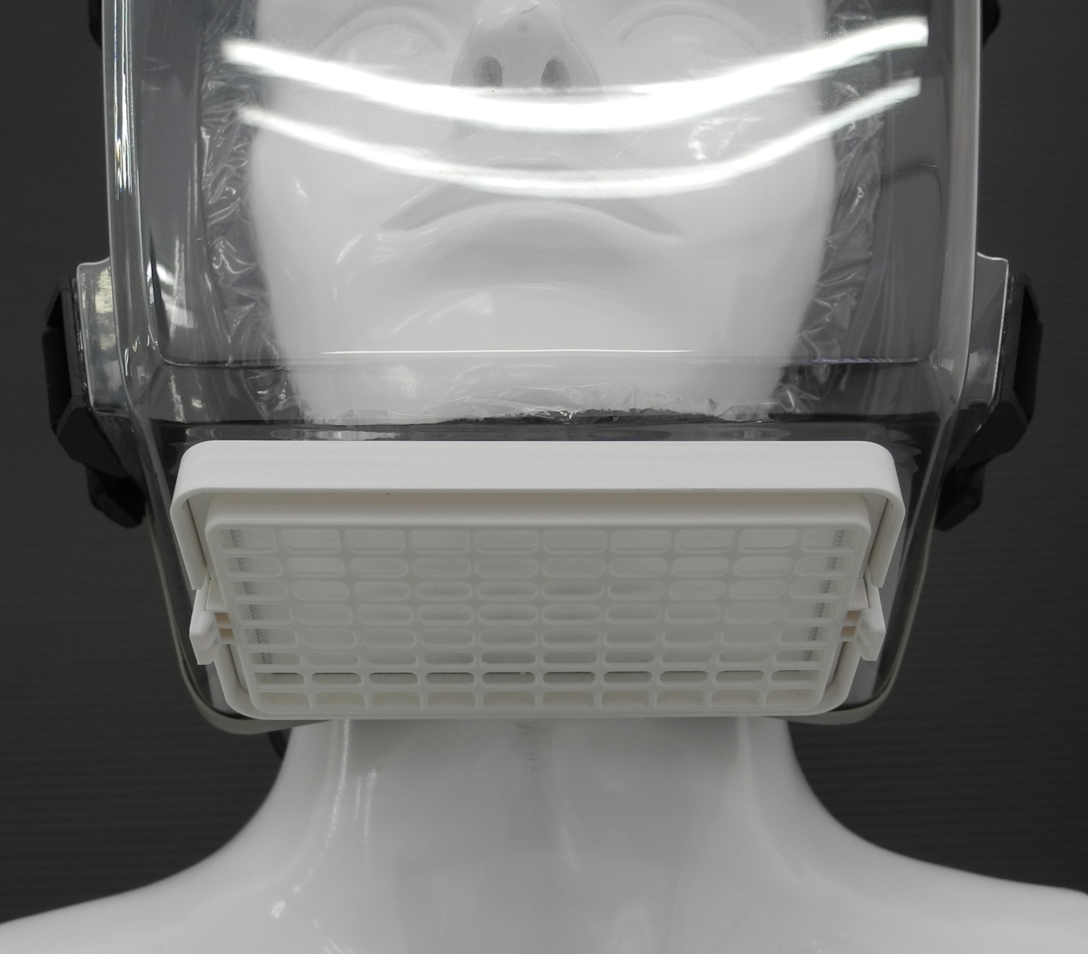 この2つは超音波融着で完全に接合され、顔との接触部分のスポンジ素材をぴったり圧着すると気密がとられるため、常に陽圧でクリーンな状態をキープします。