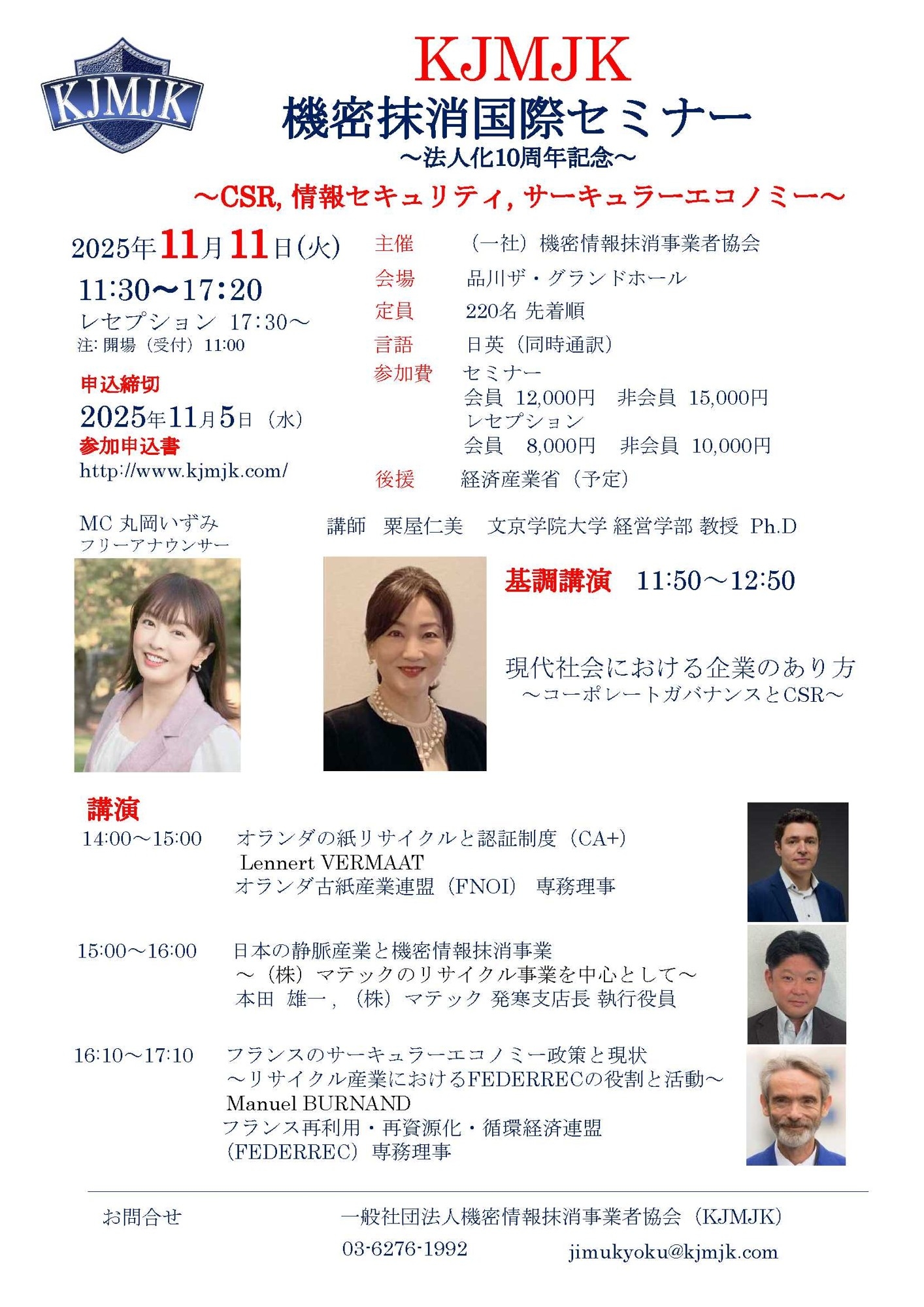2025年は、本協会が法人化して10年目にあたります。今年度のセミナーは、協会法人化周年記念も兼ねて、2025年11月11日に国内外から4名の講師を招聘し、「CSR、情報セキュリティ、サーキュラーエコノミー」をサブテーマとして機密抹消国際セミナーを開催します。