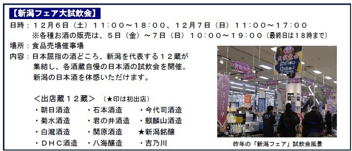 当フェアでは、日本一の蔵元数を誇る新潟を代表する12蔵が集結し、各酒蔵自慢の日本酒を取り揃えます。また12月6日(土)・7日(日)の2日間、各酒蔵が日本酒を紹介しながら販売する「新潟フェア大試飲会」を開催します。
