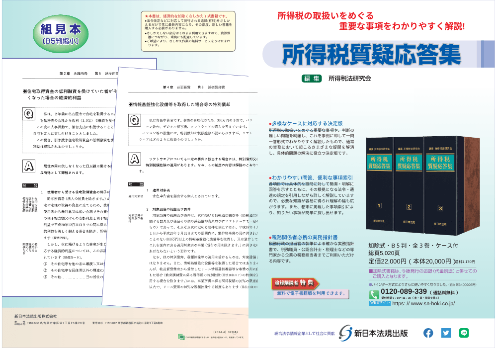 新日本法規出版株式会社(所在地:愛知県名古屋市中区栄1丁目23番20号、代表取締役:星謙一郎 (https://www.sn-hoki.co.jp/))は、1991年10月に発行した「所得税質疑応答集」を増刷し、2024年5月7日(火)に入荷いたしました。