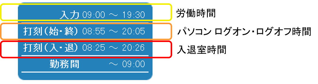 (2) 2つの客観的時間(パソコンのログオン・ログオフ、入退室時間など)と労働時間の一元管理で、労働時間と客観的時間の差異を把握できます。
