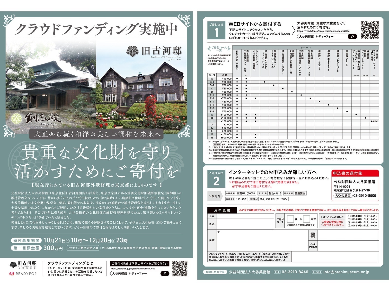 そこで、昨年に引き続き、公益財団法人大谷美術館の文化財運営維持管理費を目的とした第3弾のクラウドファンディングを立ち上げる運びとなりました。目標金額は第一目標300万円、最終目標1,200万円です。これらの資金は、旧古河邸・銅御殿の維持修繕に必要な経費として使用される予定です。特に、建物の老朽化に伴う修繕は避けて通れない課題であり、私たちは古い状態を可能な限り保ちながら、適切な修復作業を行う方針です。