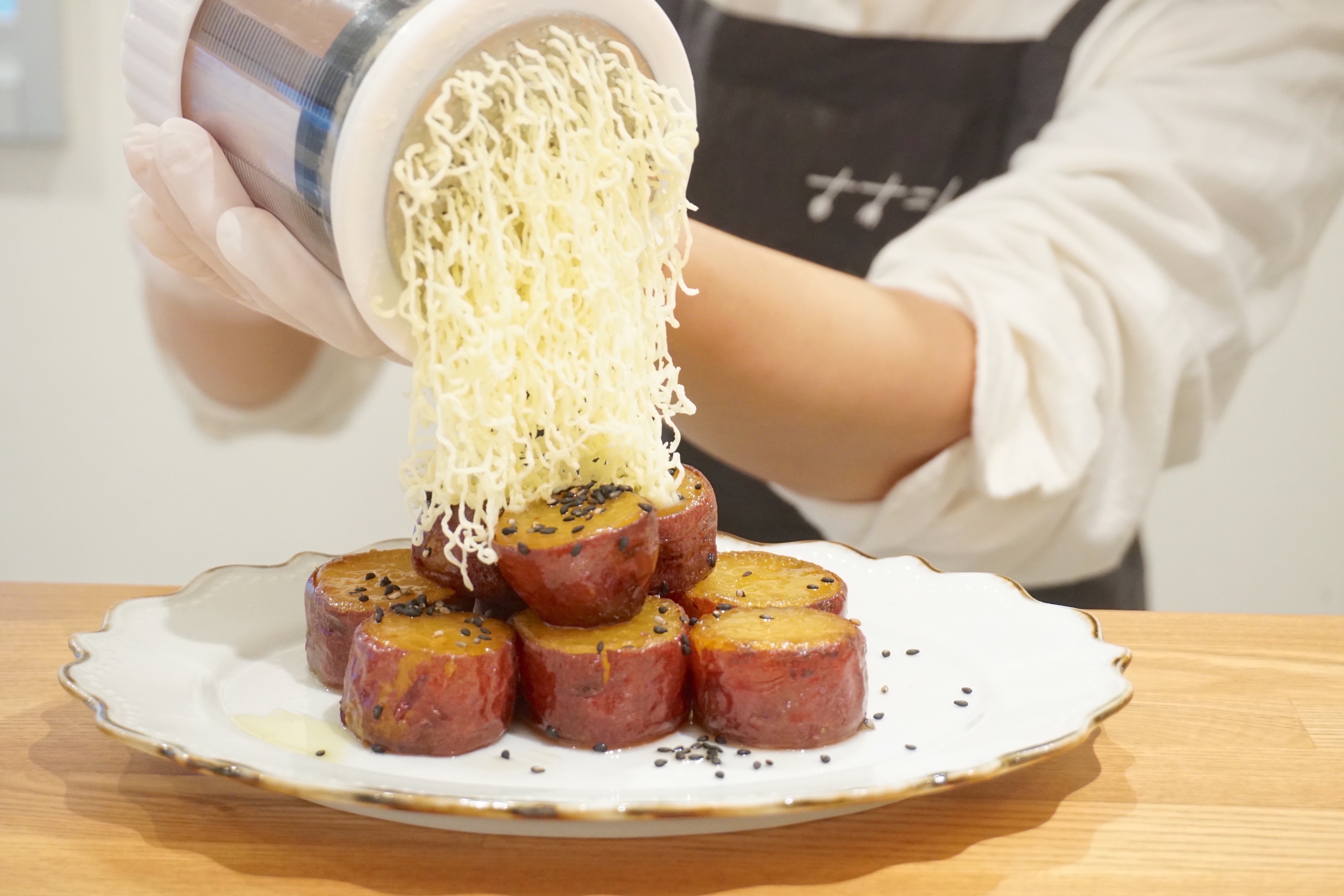 オープン後は焼き芋スイーツ専門店「ナナシノ焼芋店」から始まります。一番人気であった焼き芋の上に自家製のカスタード生クリームをブリュレした「ぷっくり焼き芋クレームブリュレ」や大学いもの上に口溶けの良い雪印北海道バターを載せた「ねっとり大学いもバター」の提供を行います。どちらも目の前でバーナーで炙るブリュレの仕上げや、糸状のバターを絞る仕上げを行います。