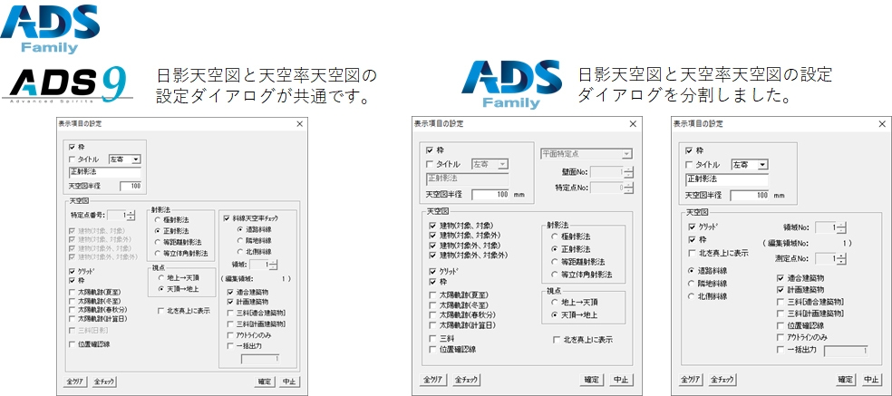 日影天空図と天空率天空図に出力の設定を分割し簡略化することで、設定項目が分かり易くなりました