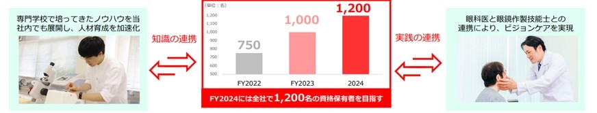 私どもは、眼鏡医療技術専門学校「ワールド オプティカル カレッジ」と連携して人材育成の充実・加速を図ることにより、 2024年度に国家資格「眼鏡作製技能士」 1,200名の資格保有者を目指しています。