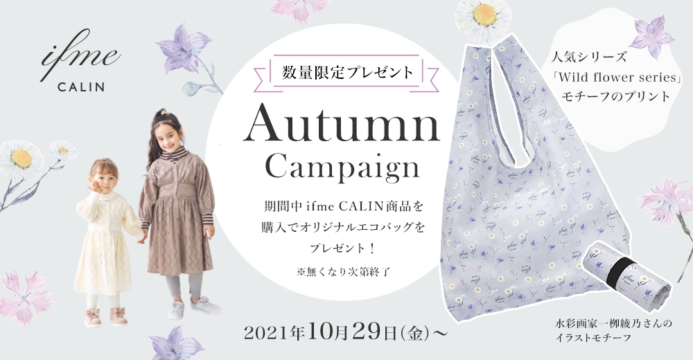 この他にも、可愛く機能性も備えたベビーシューズ、キッズシューズを展開しています。10月29日(金)よりスタートしたオータムキャンペーンでは、イフミーカランの商品をお買い上げのお客様に、wild flower seriesのモチーフが描かれたオリジナルエコバッグをプレゼントいたします。ぜひこの機会にお近くの店舗または、公式オンラインストアをご覧ください。