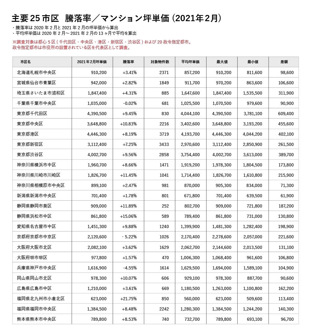 ・主要25市区での騰落率1位は「福岡県北九州市小倉北区」の+21.75%。