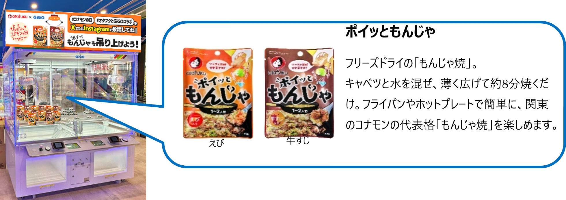 友達、家族、仲間と囲んでワイワイと楽しめるクレーンゲーム&お好み焼。5月7日(水)「コナモンの日」にGiGO総本店のクレーンゲームで遊ぶと、オタフクソースの商品「ポイッともんじゃ」がゲットできるイベントを開催します。クレーンゲームと「ポイッともんじゃ」で、こころ踊る、話はずむ、ライブな楽しい時間を楽しもう!