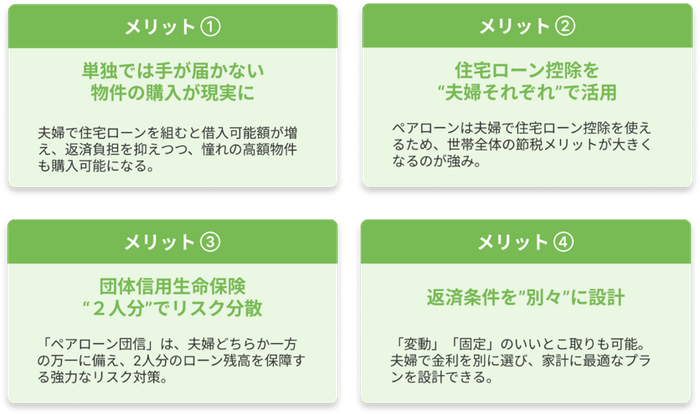 • ペアローン:同じ物件に対して夫婦それぞれが別々に住宅ローンを契約する方法。