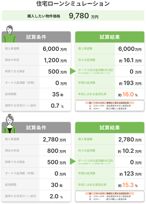※数値は上記条件で算出し、他に返済が必要な借入金はない前提。実際の返済額は金利・期間・ボーナス併用の有無等で変動する点にご留意ください。