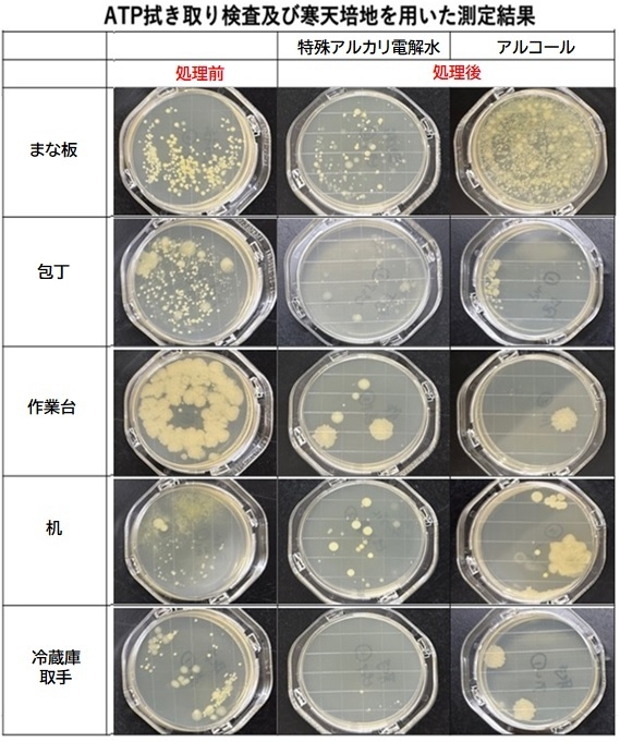 飲食店(郷土料理店)における超アルカリ性電解水と、アルコール・化学洗剤の洗浄・殺菌効果の比較検証