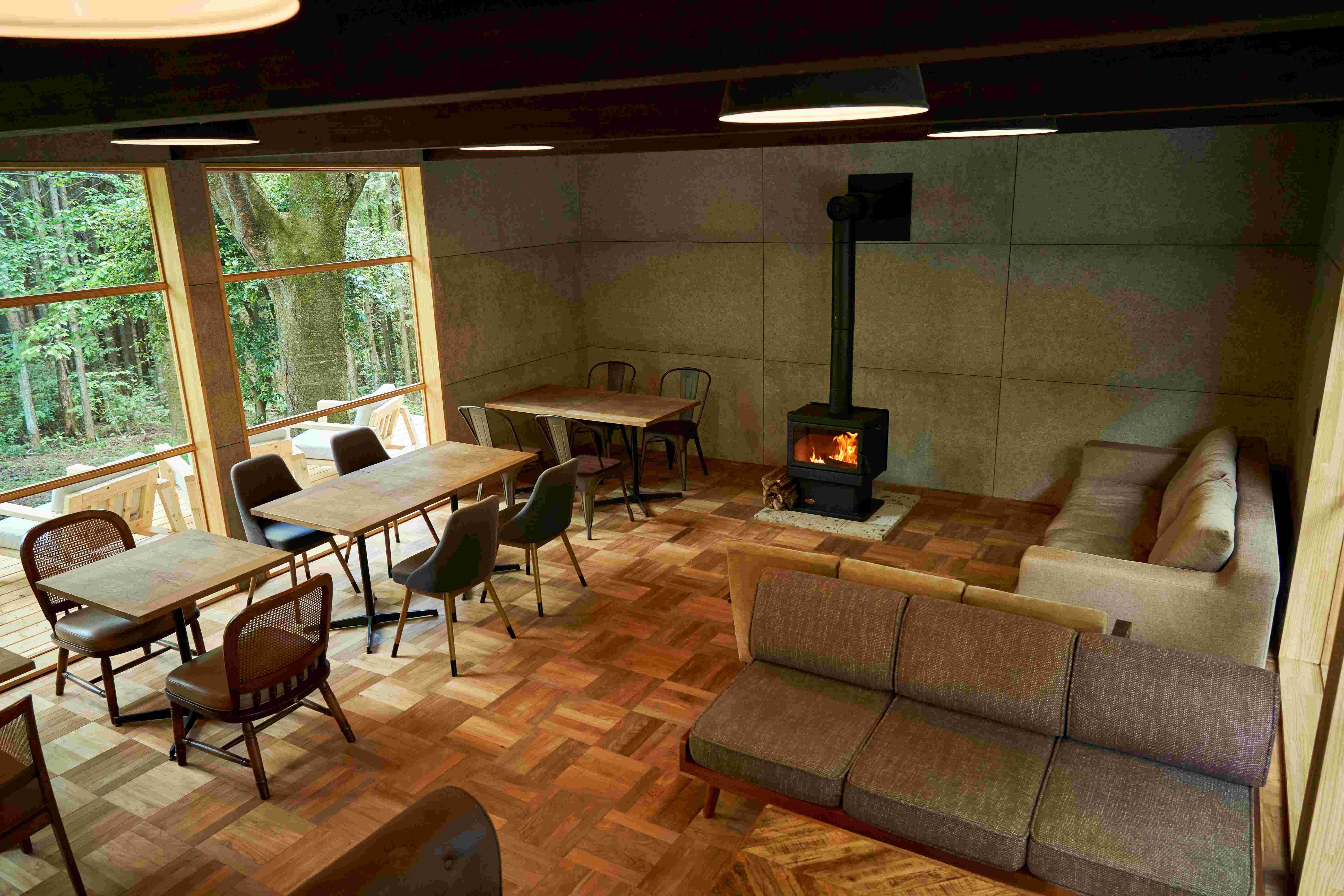 ガラス張りで森林の木々と一体となった空間で地産地消の食、・自家焙煎珈琲、オリジナルハーブティーを味わえるカフェ。開放的なテラス席ではペットも一緒にのんびりとしたカフェ時間を味わえるようになっております。