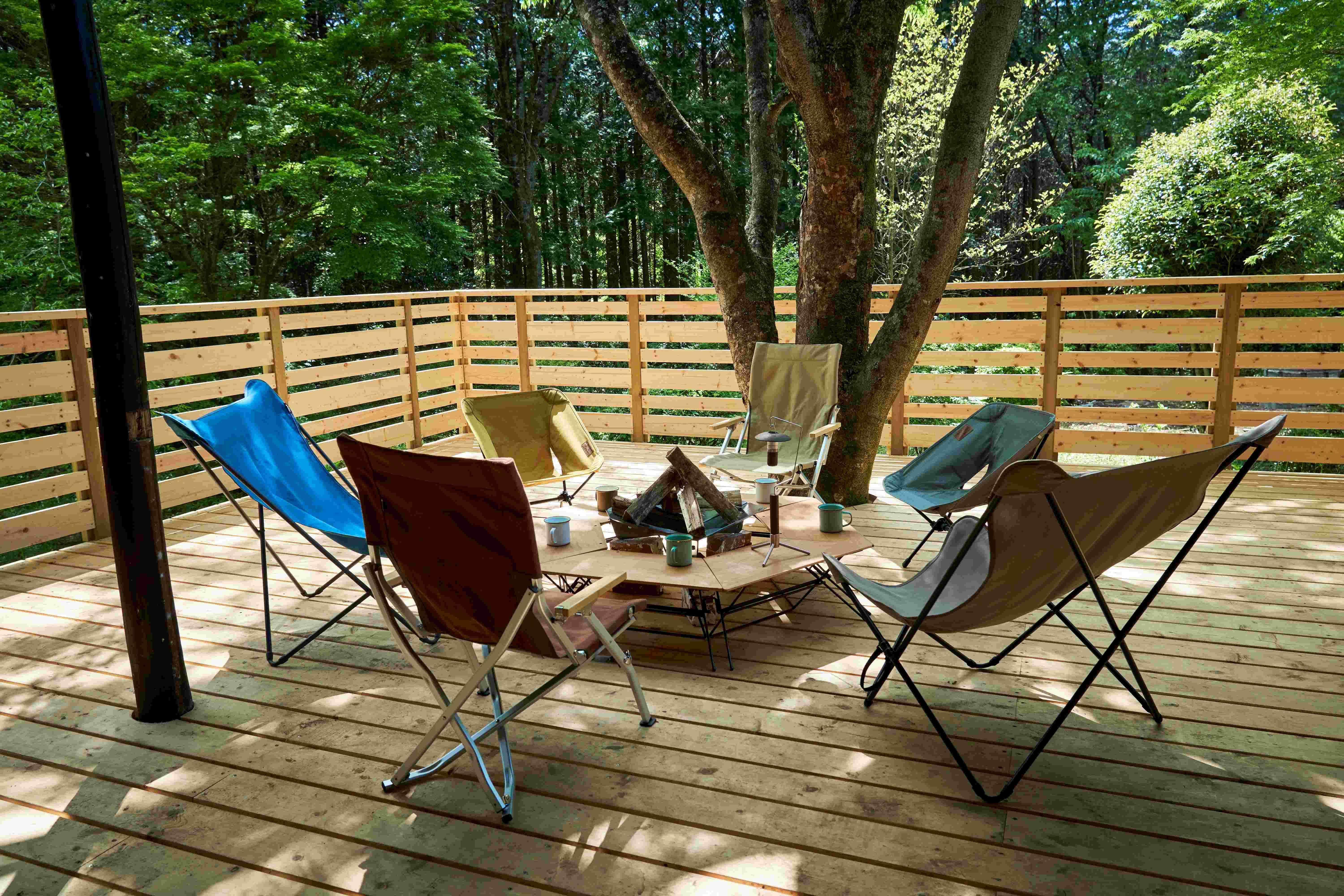 ・キャンプギア家具に囲まれ、ファミリー、ご夫婦、お二人などプライベート利用に最適な空間と高台テラスが特徴な棟