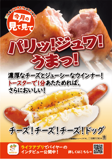 ライフが自信を持っておすすめする「今月の見て見て」の11月商品に選ばれた「チーズ!チーズ!チーズ!ドッグ」は、商品名からもわかるように、ゴーダ・ステッペン・チェダーの3種類のチーズを贅沢に使用したホットドッグです。サンドしているウインナーは天然腸を使用しておりパリッと食感を楽しめ、ジュワッとジューシーな味わいでこだわりのチーズともよく合います。