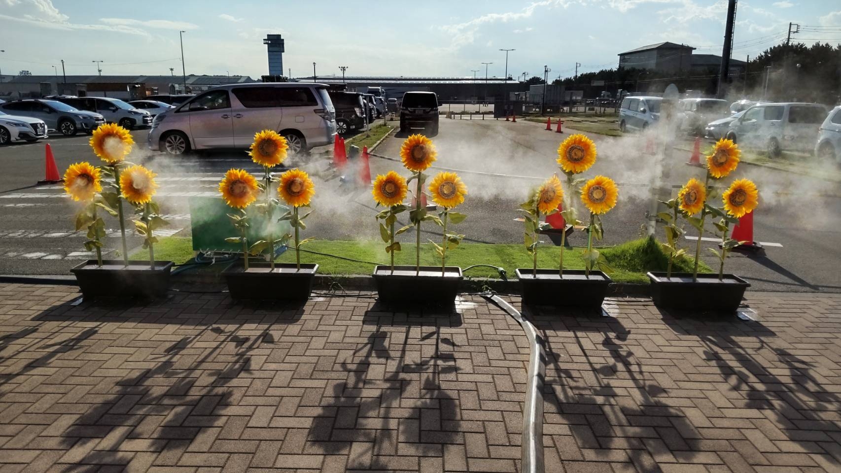 暑い中来てくださった皆様を、ひまわりミストシャワーがお出迎えしてくれます。めんたいパークに入る前に涼めます。