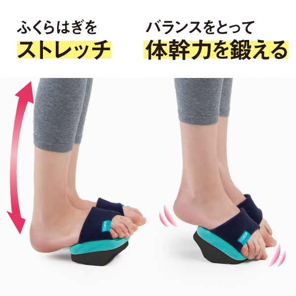 トップアスリート、スピードスケート、オリンピック選手などが実践している体幹トレーニングの一環。一本下駄の上で体幹を鍛えるためにスクワットなどの運動をしているということから企画を開始し本格的プロ仕様ではなく「ながら体幹トレーニング」が手軽に出来る仕様のスリッパを女性目線で企画したスリッパです。一本歯に見立てたソール部分にに立つだけで深層筋にアプローチ。体幹力を向上させ、基礎代謝を上げることで、痩せやすいカラダづくりを目指します。