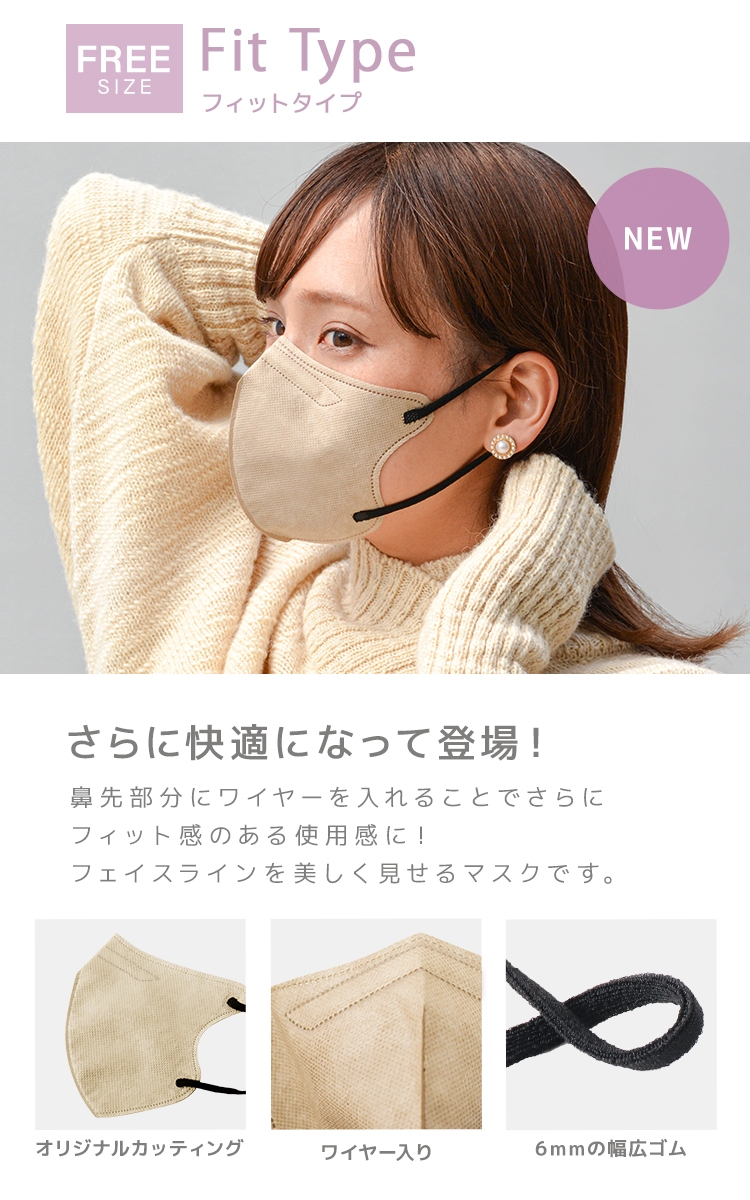 フリーサイズで快適に誰でも隙間なく輪郭にフィットする『オリジナル立体構造』は変わらず、更にノーズワイヤーが美しいシルエットキープします。