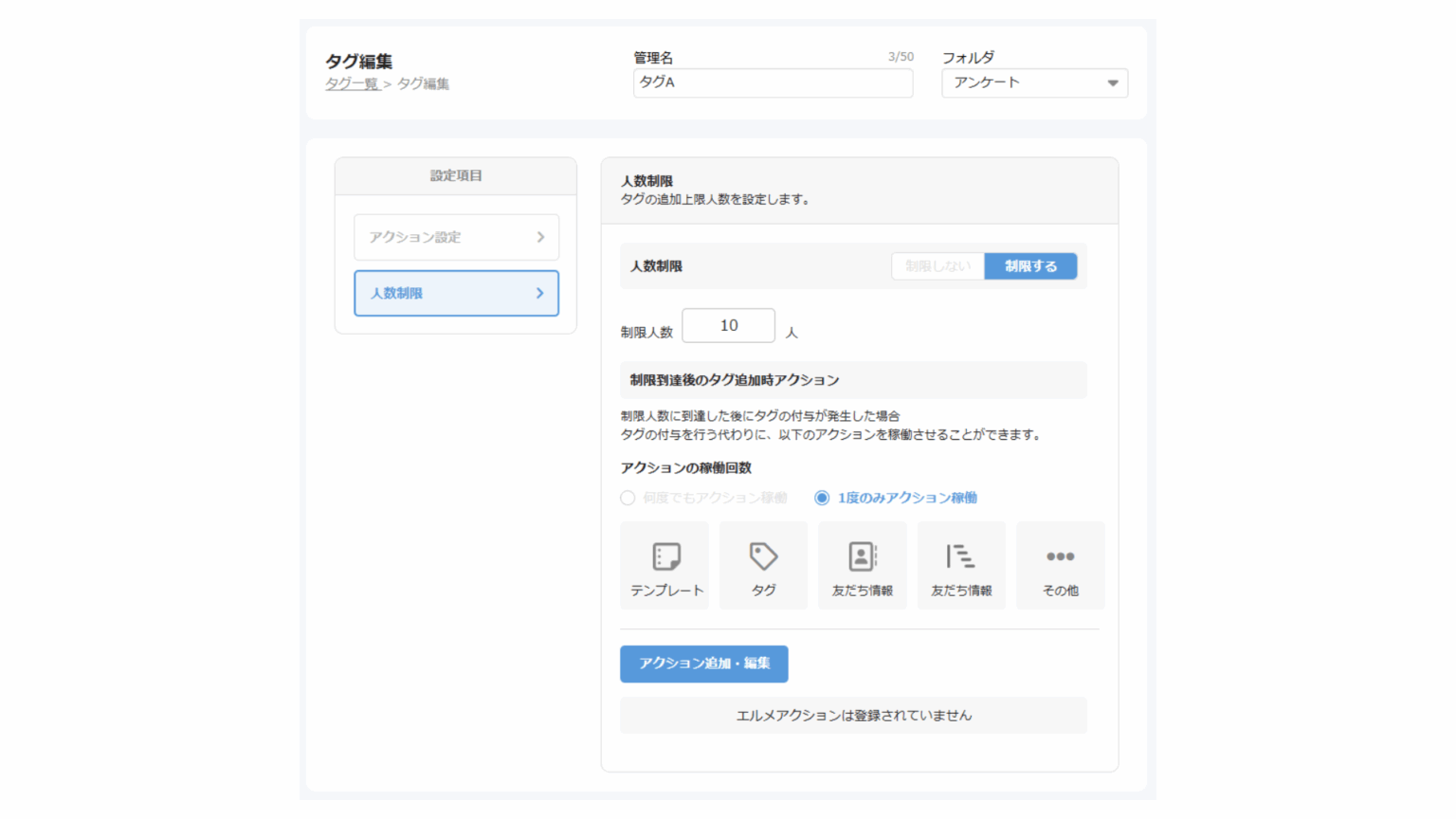 また、上限に達した場合には、タグ付与に代わり「キャンペーン終了のお知らせ」など、あらかじめ設定したアクションを自動実行することも可能です。
