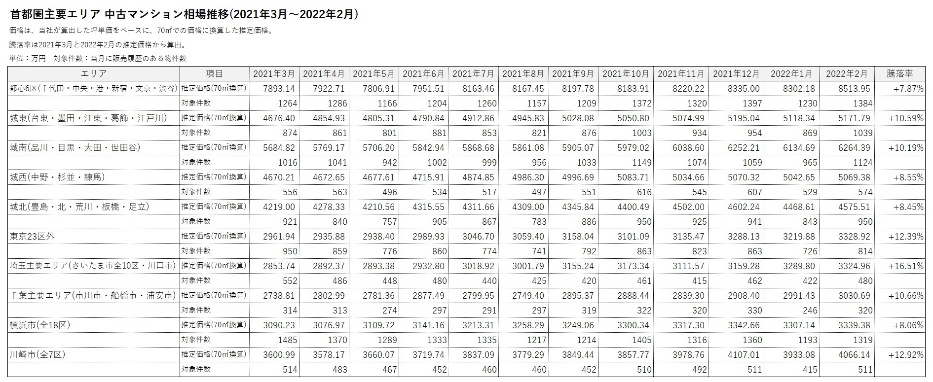 「不動産×WEB×ビッグデータ」の領域で、さまざまな不動産テックサービスを展開する株式会社ワンノブアカインド(本社:東京都港区、代表取締役社長:川島 直也、以下当社)は、当社が運営するマンション情報サイト「マンションレビュー」の保有データを元に、2022年2月の全国市区町村における中古マンションの相場を調査。坪単価をベースに70平方メートルでの価格に換算した「中古マンション価格」*1のランキングおよび首都圏や大阪など主要エリアでの相場推移、都心5区(千代田区・中央区・港区・新宿区・渋谷区)に20政令指定都市を加えた25市区での相場推移について発表いたしました。