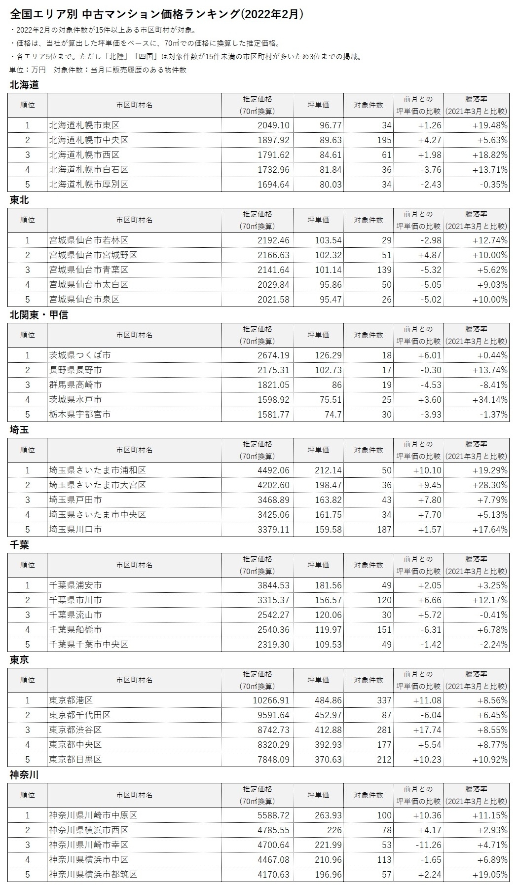 ■全国エリア別 中古マンション価格ランキング(2022年2月)