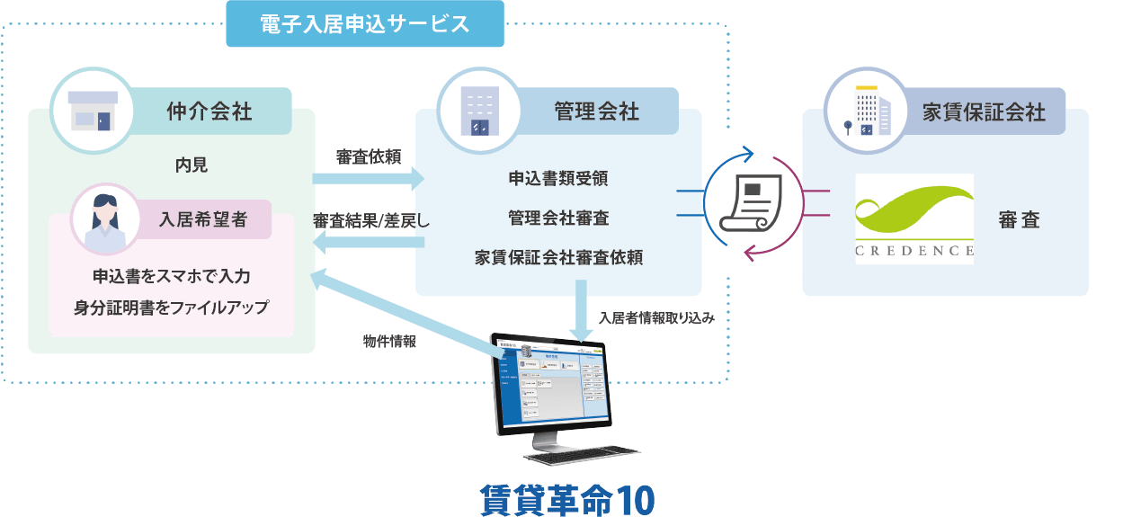 入居申込をオンラインで完結する日本情報クリエイトの「電子入居申込サービス」とクレデンスが提携を行うことにより、家賃保証サービスをご利用いただく入居希望者様、仲介会社様、管理会社様はこれまでと比較して、手書きでの保証申込書作成の手間や記載漏れの確認などのストレスが少ない、スムーズな保証審査が可能となります。