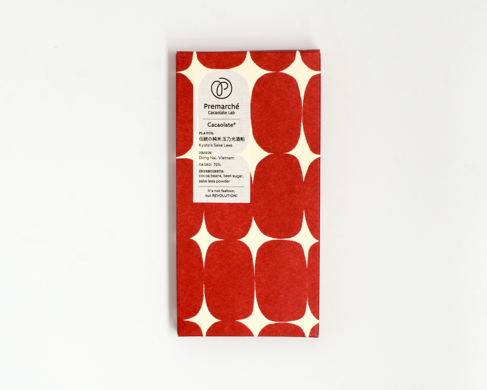ベトナム・ドンナイ産カカオに、京都が誇る純米酒・玉乃光の酒粕を無水加工して加えました。くり返しプロファイリングして見出したドンナイ産カカオによるダーク感と、純米酒粕特有のアミノ酸によるうまみのハーモニーをお楽しみいただけます。カカオ75%。