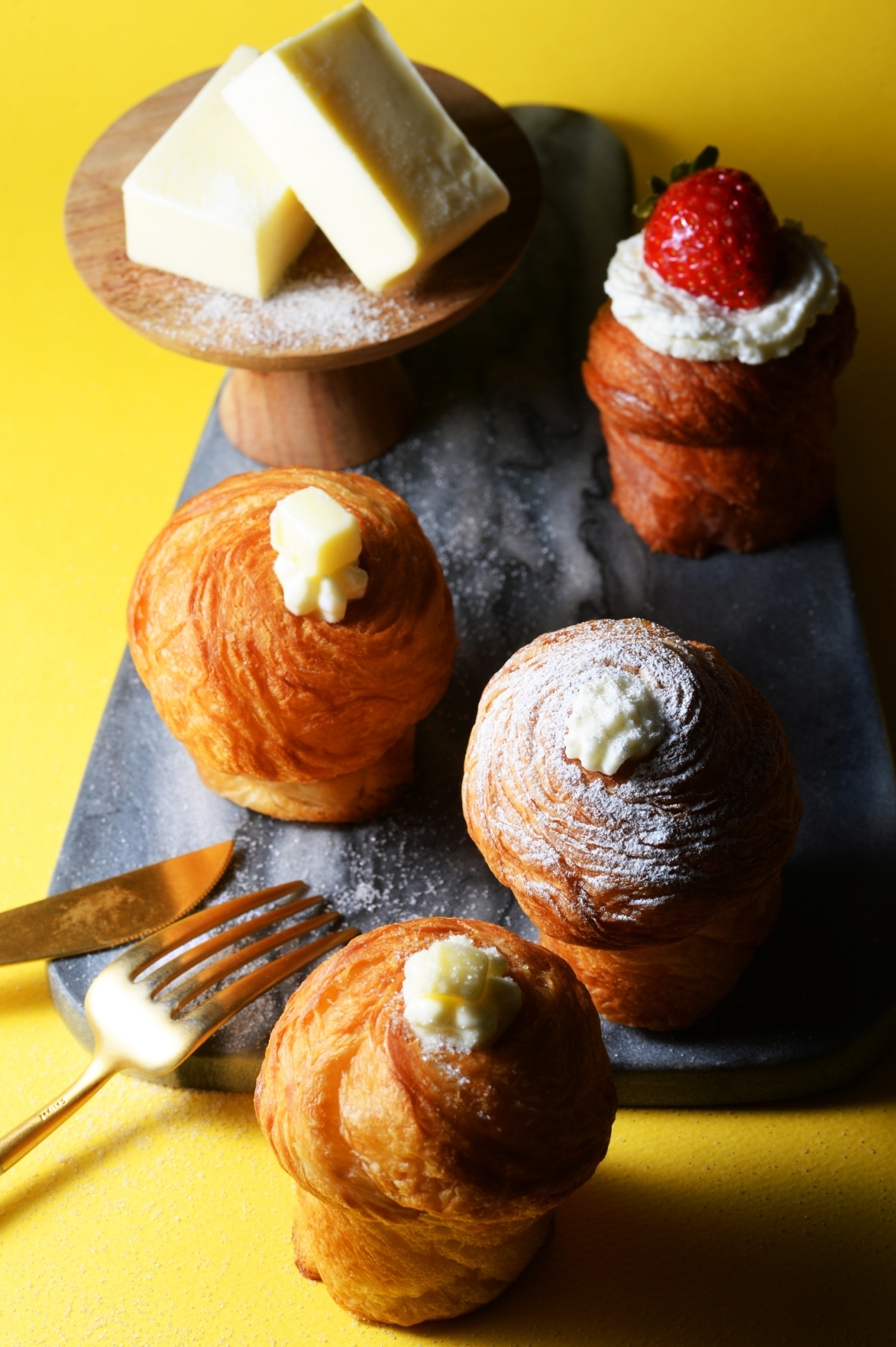 まさに“クロワッサン”と“ベーグル”のいいとこどりのベーグル、それが「クロワッサンベーグル」です。味はプレーン、発酵塩バター、セミドライトマト&ハーブなど全6種で、“カリッ!もちっ!”の食感が幸福への道へと誘います。