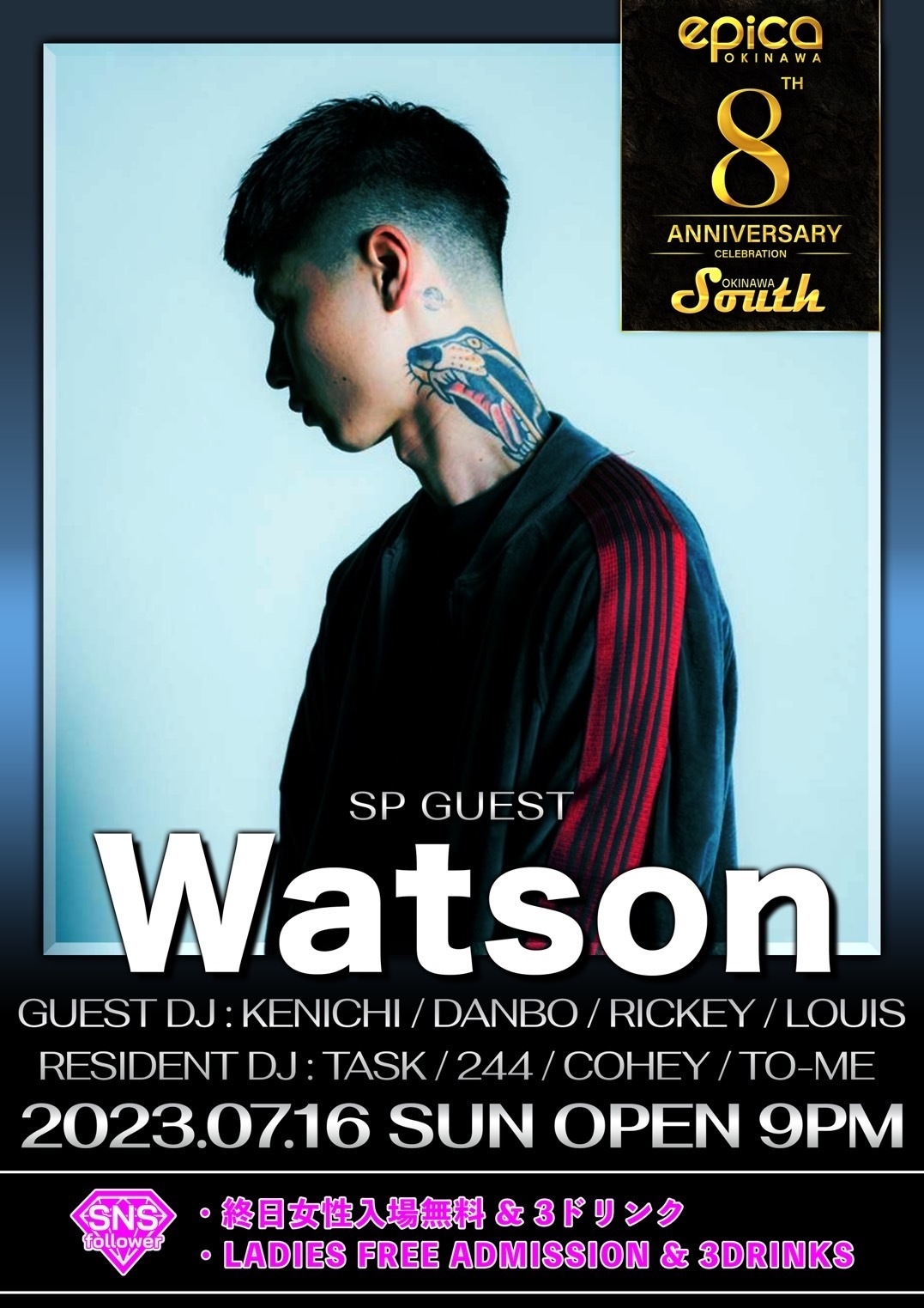 沖縄の那覇市松山ナムラプラザビル3階で運営する、320坪の国内最大規模のナイトエンターテインメント【epica】にて、スペシャルゲストの【Watson】を迎え、epica 8周年パーティーを2023年7月16日(日)に開催します。