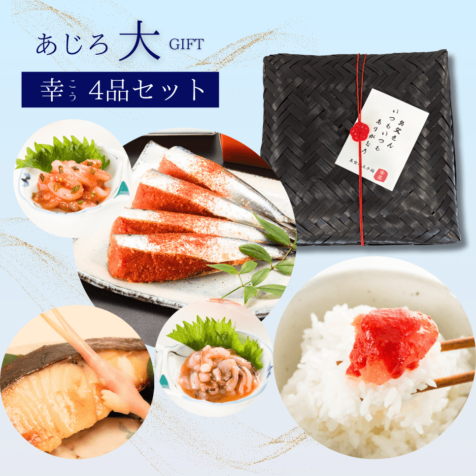 新鮮なスケトウダラの卵を厳選し、赤穂天然塩、備長炭活性電解水を用いた塩水にて一つ一つ丹念に作りこまれ、特製香味出汁に漬け込んだ香味たらこから辛子明太子レギュラー味、大吟醸辛口、昆布味です。