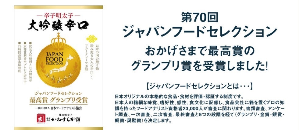 他社との相違点がある大吟醸辛口明太子は、ジャパンフードセレクションの最高賞のグランプリ賞を受賞するなど、多くの方から支持を得てここまでくることができました。