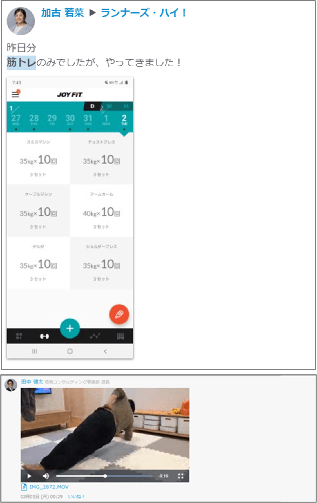 当社では、健康づくり活性化のために社内SNSを活用。ランニングやウォーキング、筋トレ等の健康な取り組みの記録を、社内のSNSにアップし合いメンバーで共有しています。
