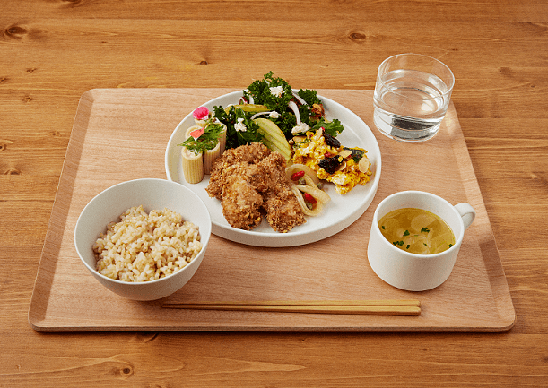 米売り場と連動した玄米または白米、メイン、デリ、スープが付いたプレートセット。メインやデリは数種類ある中からお好きなものをチョイスできます。
