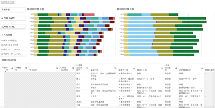 共立女子大学では現在、蓄積されている入試データや就職進路データといった各種情報を用いながら、すべての部署で様々なデータ分析にQlik Senseを役立てています。例えば、オープンキャンパスに参加した学生に対し、留学率や就職状況などの情報を相談を受けながらリアルタイムに提供したり、教員に対して学生の出席率などを迅速に共有する、高校訪問時に進路指導担当者へ有益な情報提供を行う、直近ではコロナ禍でオンライン授業の履修状況などを分析し次期の学修支援体制を検討するなど、様々な業務で活用されています。