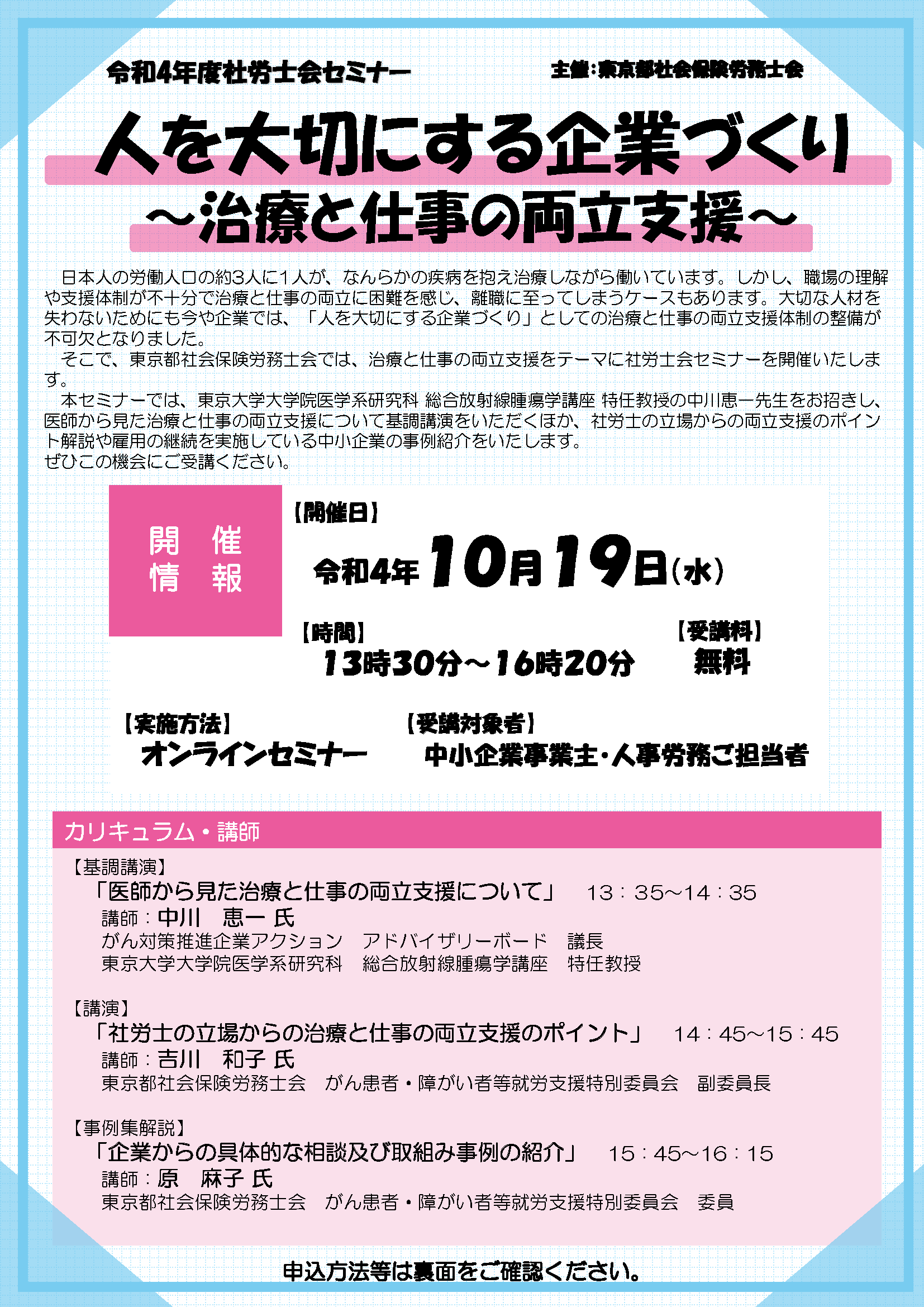 東京都社会保険労務士会(会長:寺田 晃)は、日本人の労働人口の約3人に1人がなんらかの疾病を抱え治療しながら働いている一方で、職場の理解や支援体制が不十分で治療と仕事の両立に困難を感じ離職に至ってしまうケースが散見されることから、「人を大切にする企業づくり~治療と仕事の両立支援~」をテーマに社労士会セミナーを以下のとおり開催します。