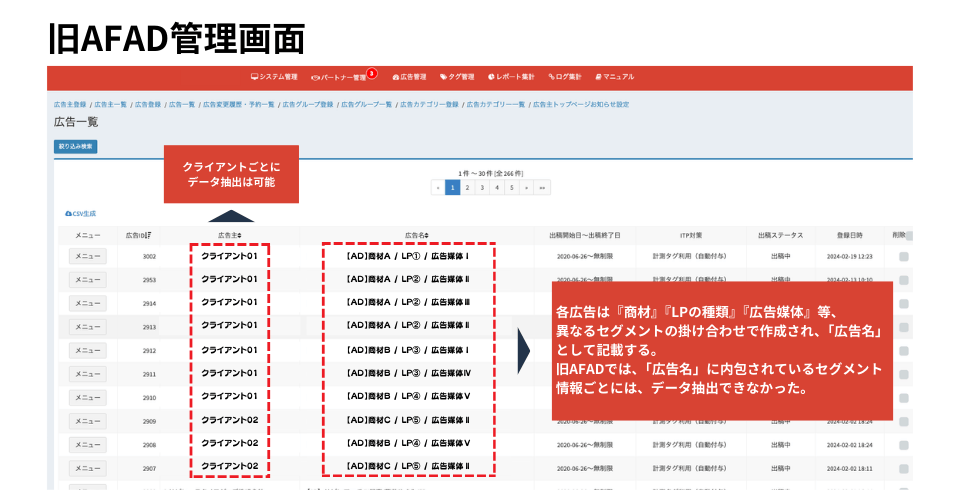 このため、「広告名」の内部に包括されるセグメントごとに管理することが難しく、管理のために管理画面から吐き出したCSVデータをスプレッドシートに反映し、データをフィルタリングする必要がありました。