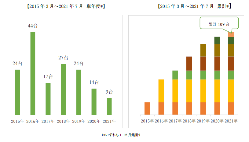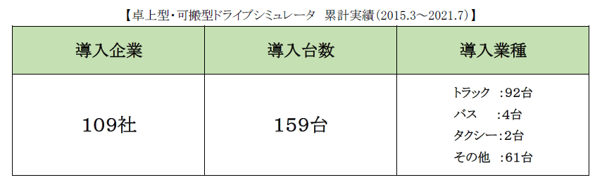 また、仮に指導監督の一環として、一般診断(任意診断)を行うにしても、実施機関の設備には 限りがあるた め、受診予約しようにも、予約で一杯になるケースが多く見られるようです。 昨年、感染症予防の観点から実施機関が一般診断(任意診断)の受付が停止されたこと、 旅客需要の減退 によりドライバーへの教育時間の見直しの動きが各社にあったことを受け、卓上型ドライブシミュレータの引き合 いがやや増えたものの、実績はここ数年伸び悩んでいる状況です。 累計導入企業数は、7月末時点で100社を超えました。 潜在的にはまだまだ体験型の安全教育ツールとして需要があると考えており、今後認知活動を続けてゆく予 定です。当社としては、今後、国土交通省による「事故防止対策支援推進事業」に、あらたに「非接触 指導監 督に資する機器」の創設を働きかける予定です。