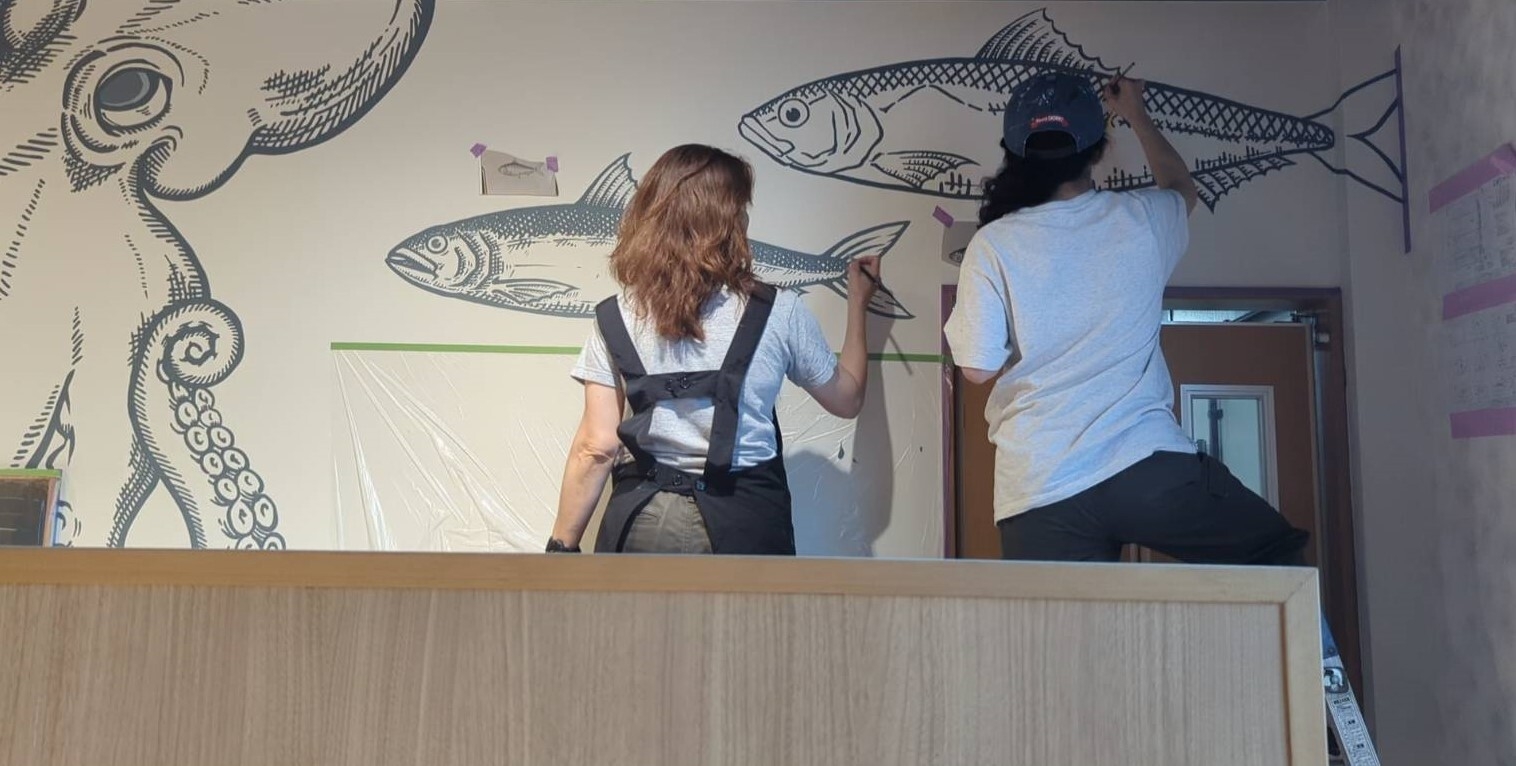 グランドオープンする「南房総 やまと寿司 あすみが丘店」の店内の壁面には、「小だるま工房」の壁画師により描かれた、「まぐろ」や「いわし」「たこ」など様々なお魚たちが、訪れる方をお迎えします。