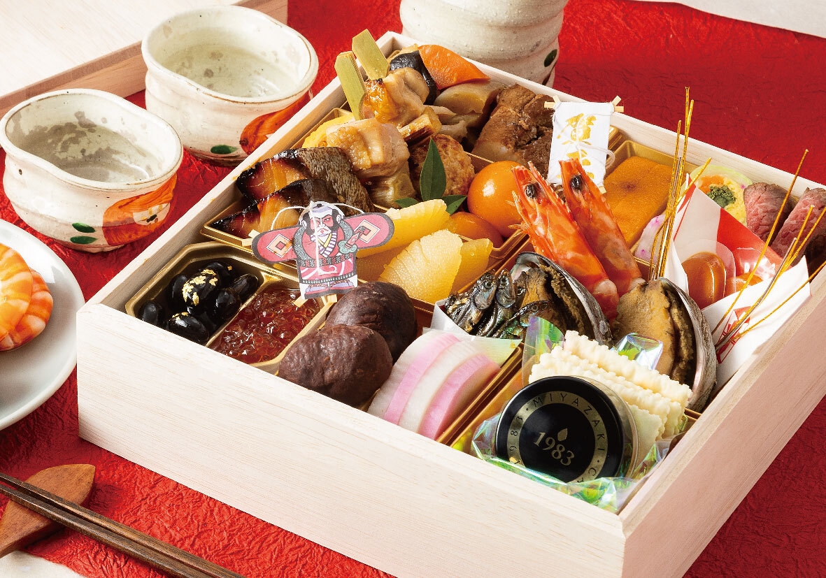 うまや自慢の“みつせ鶏の串焼き”や高級食材“宮崎産キャビア”をはじめ、九州の郷土料理や食材がたくさん詰まった、和みとおもてなしのおせちです。